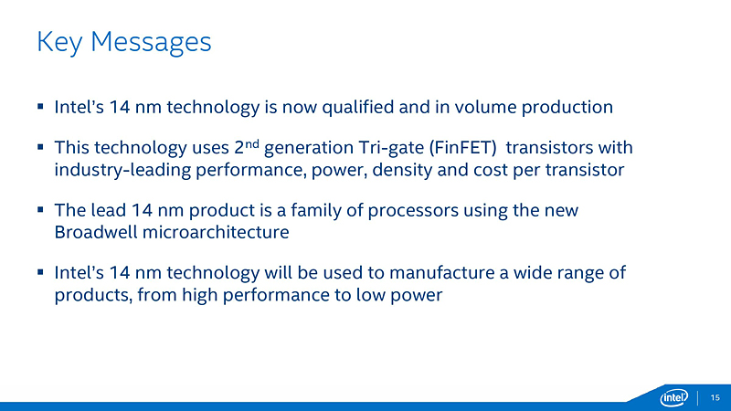 Intel은 올해 (2014년) 후반부터 출하를 시작하는 14nm 공정의 개요를 밝혔다. Intel에게는 3D 트랜지스터 "트라이 게이트 트랜지스터"의 제 2세대이다. 늦고 늦은 14nm 공정이지만, 베일을 벗은 그 스펙은 매우 높았다. 트랜지스터 성능과 전력에 대해서는 Intel 대략적인 상대적 숫자의 스펙 밖에 공표 없었기 때문에 잘 모르겠다. 그러나 트랜지스터의 형상 크기의 숫자만 보면 비교적 공격적으로 파운드리의 3D 트랜지스터와 비교해도 뛰어나다.