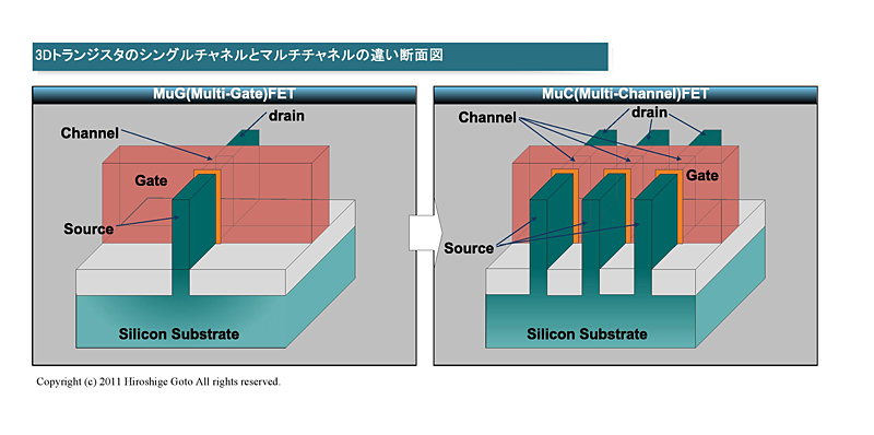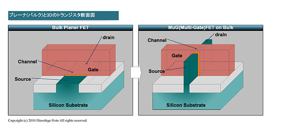 덧붙여, 그림을 보면 알겠지만, 게이트와 채널 사이에는 게이트 절연막 (게이트 산화막)이 있다. 고유 전율 막 / 금속 게이트 (HKMG : High-k / Metal Gate) 재료가 사용되고 있는 것은,이 산화막 부분이다. High-k 이면 유전율이 높기 때문에 산화막 두께를 두껍게 할 수 있다. 그러면 포텐셜 장벽이 커지고 터널 효과로 빠지는 전자를 줄이고, 게이트 누설 전류를 줄일 수있다. 3D 트랜지스터는 High-k 메탈 게이트도 조합한다.