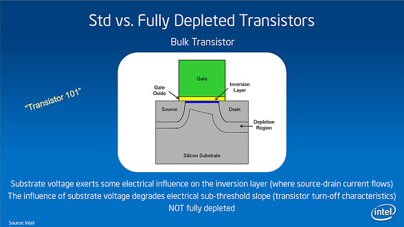 미세화 된 현재 벌크 평면형 트랜지스터에서는 게이트 길이가 짧아지고, 단 채널 효과 (SCE : Short Channel Effect)가 문제가 된다. 게이트 길이가 짧아지는 경우 문턱 (Subthreshold) 전압 (Vt)이 저하되고, 게이트에 전압을 가하지 않는 오프 상태에서도, 소스와 드레인 사이에서 전류가 흐르는 서브스레숄드 (Subthreshold) 누설 전류가 증가한다. 평면 트랜지스터에서는 이 문제 때문에 게이트 길이를 좀처럼 단축하지 못하고 있었다. 실제로는 외에도 여러가지 문제가 있어, 벌크 평면은 한계에 도달했다.
