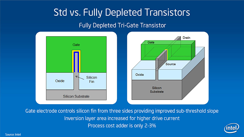 대체, 무엇이 3D인가? 트랜지스터는 소스, 드레인, 게이트의 각 영역 사이의 전위차로 동작한다. 대략적인 원리는 드레인에 일정한 전압을 건 상태에서 게이트 전극에 걸리는 전압을 올려 문턱 전압보다 높이면, 소스 - 드레인 사이의 바디 표면에 반전층 이른바 채널이 형성되어 전류가 흐르기 시작한다. 이 소스 - 채널 - 드레인을 입체화 하는 것이 3D 트랜지스터다.
