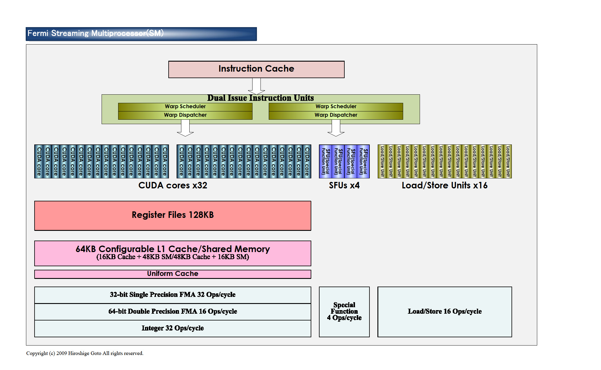 Fermi에서는 SM에 4개의 SFU가 탑재되어 있어 SFU와 프로세서 코어의 비율이 바뀌었다. 명령 유닛은 듀얼이 되고 다른 WARP의 명령을 동시에 발행 할 수 있다. 이것에 대해서는 후의 기사에서 설명하겠지만, Tesla의 기본적인 스케줄러의 흐름을 계승하면서 제어 하는 입도를 높이는 것으로, 상대적인 단순화를 도모하고 있다.