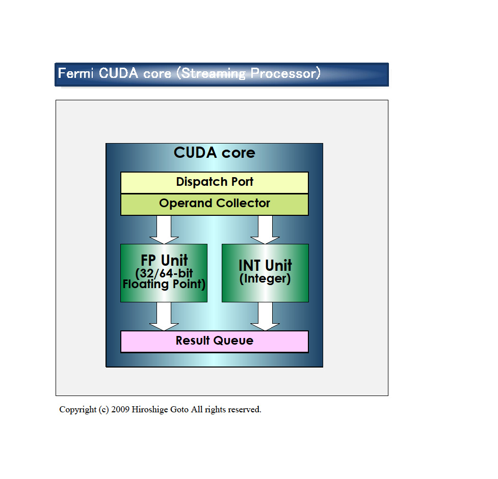 Fermi에서 배정밀도 부동 소수점 연산은 전용 유닛이 아닌 각 프로세서 코어 CUDA core에서 실행하게 되었다. CUDA core는 단정도 부동 소수점 연산을 1 사이클 throughput로 실행할 수 있지만, 배정 밀도 연산도 2 사이클 throughput로 실행할 수있다. 따라서 Fermi에서는 배정도의 성능은 단 정밀도의 절반이 된다. 일반적인 CPU의 배정밀도와 단정밀도의 비율과 같다. GT200에서는 단정밀도 프로세서 코어 8 개에 배정 단위가 1개로 배정도와 단 정밀도의 적화산 성능 비율은 1/8 이었다.