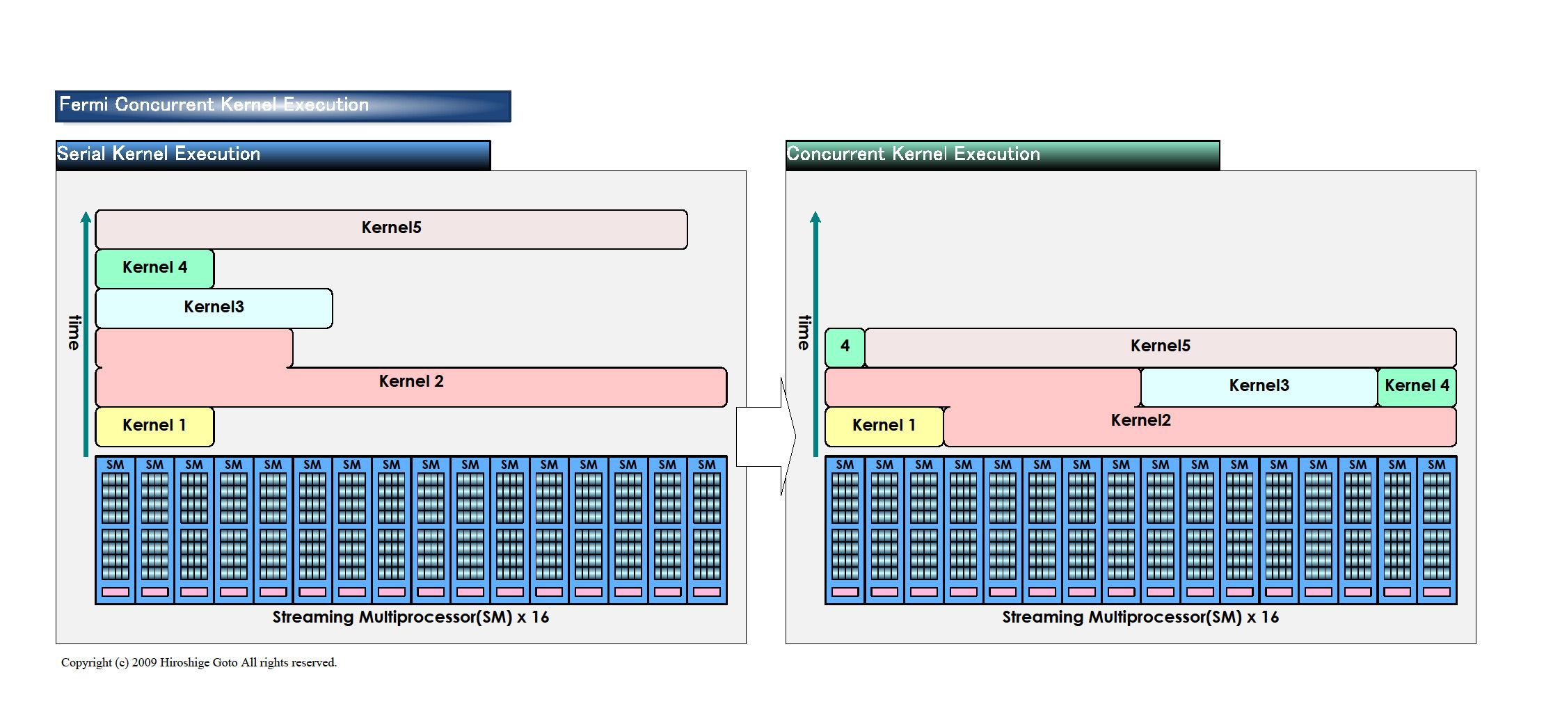 그러나 Fermi에서는 같은 콘텍스트 안의 의존성이 없는 커널 프로그램을 GPU에서 동시에 실행시킬 수있게 되었다. CPU적인 표현을 하면 "멀티 스레드" 적이다. 따라서 실행하는 스레드 수가 적은 즉 병렬도가 비교적 낮은 커널을 다수 수행하는 경우에도 복수의 커널 실행을 평행시키는 것으로, GPU를 낭비없이 가동할 수 있게 됐다.