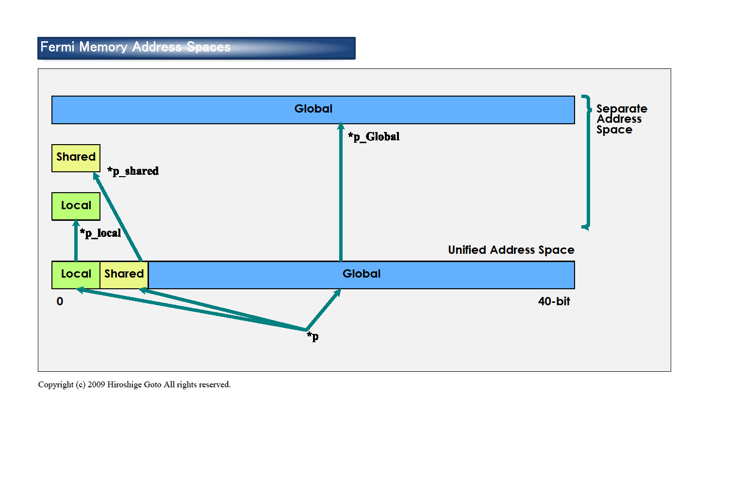Fermi에서는 계층화 된 메모리 주소 공간은 논리상은 플랫한 주소 공간에 통합되어 GPU 내부의 하드웨어에서 물리 메모리 공간에 매핑되는 방식으로 바뀌었다. 지금까지 계층마다 다른 주소 공간에 다른 로드 / 스토어 오퍼레이션이었던 것이 단일 공간에서 단일 종류의 작업으로 통합되었다. 이렇게 하면 동적 주소 포인터의 지원이 용이한 것과 동시에 메모리 계층을 향후 복잡화하는 것도 용이하게 되었다.