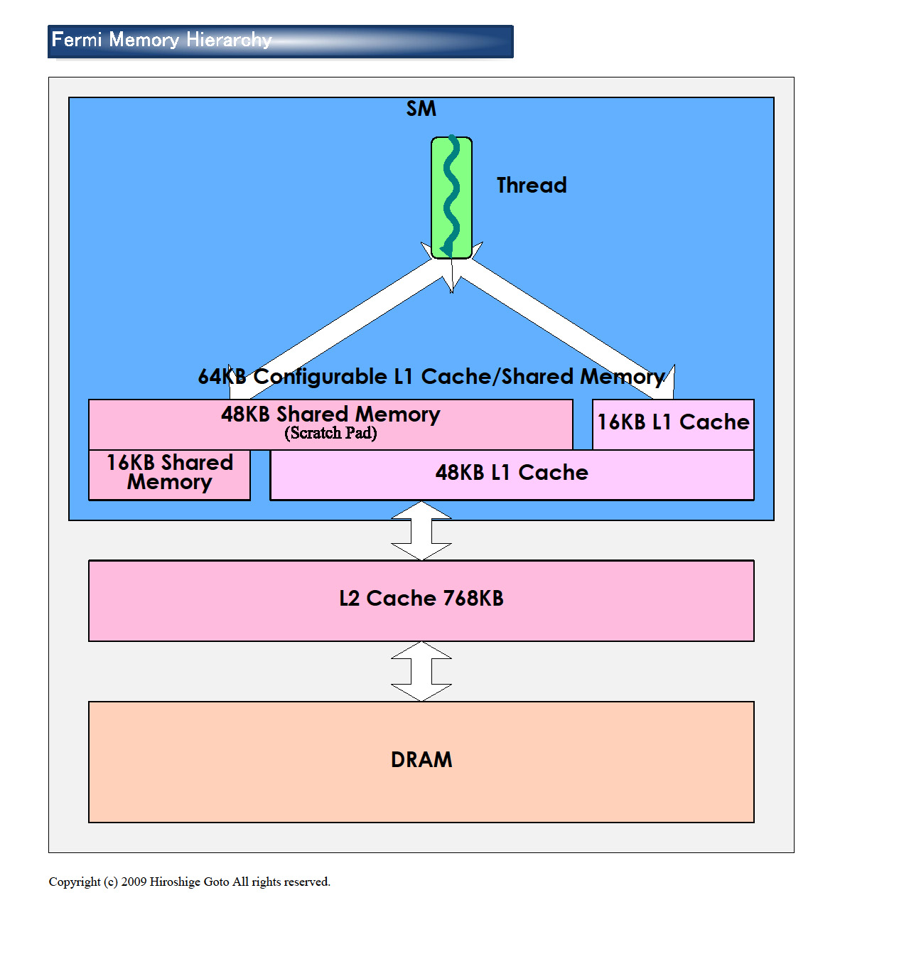 Tesla 에서는 각 SM의 내부에 쓰기 가능한 공유 메모리를 16KB 탑재하고 있었다. Fermi에서는 메모리가 64KB로 확장되었을뿐 아니라 컨피규러블 (Configurable)이 됐다. 구체적으로는 48KB의 공유 메모리와 16KB의 쓰기가능 L1 캐시 또는 16KB의 공유 메모리와 48KB의 쓰기가능 L1 캐시의 조합으로 전환 할 수있다.