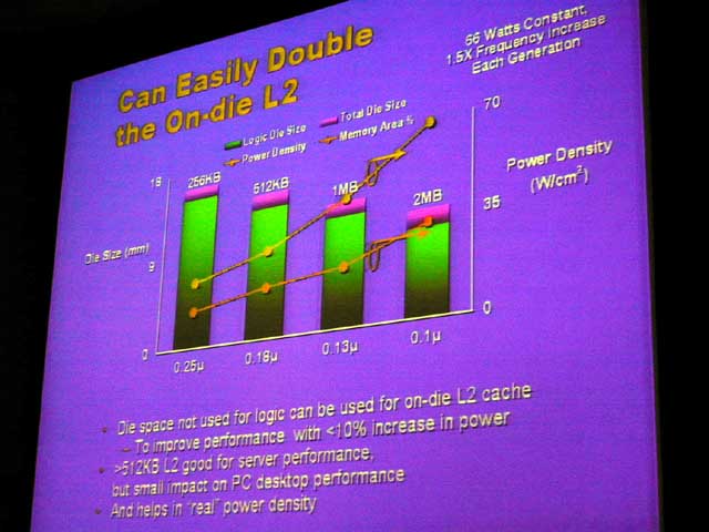 L2 캐시의 용량 증가는 향후 멀티 GHz 프로세서의 성능 향상을 돕는데도 쓸모가 있다. 그것은 이 페이스로 CPU의 코어 클럭이 올라 가면, 메모리 액세스의 패널티가 극단적으로 커지기 때문이다. L2 캐시 미스를 한 경우 페널티는 미래에는 1,000 클럭에 이르러, 인스트럭션 비용, 즉 메모리 액세스 대기가 없이 실행되는 명령 수는 수100에 이르게 된다고 얘기한다. 이 차이를 메우려면 L2 캐시를 늘리고 더욱 그 캐시에 효율적으로 프리 페치를 하는 것이 필요하다.