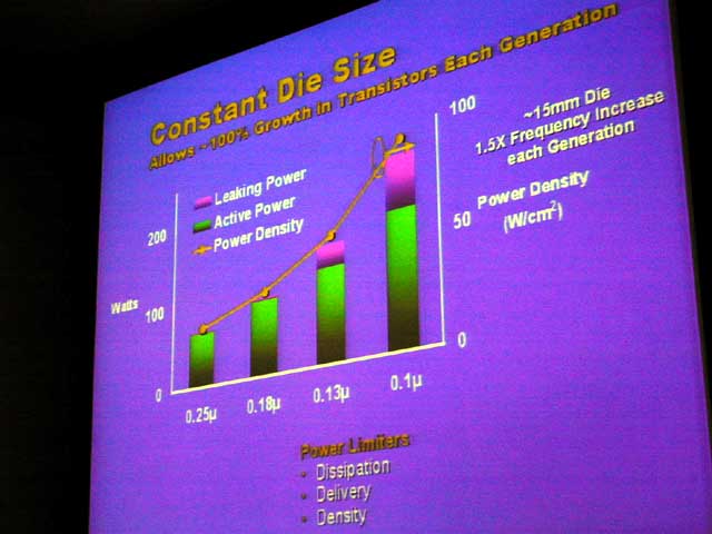 그러면 이 문제를 해결하기 위해 어떻게 해야 하는가? 겔싱어는 먼저 새로운 프로세서의 다이 크기를 이전처럼 늘리는 것이 아니라 일정하게 유지한 경우 어떻게 되는지 보여 주었다. 다이는 225 제곱 mm 정도 (Pentium 4 클래스)에서 주파수는 1.5 배 씩 세대마다 올라가는 것으로 계산했다고 한다. 그렇게 되면 소비 전력은 공정 세대가 진행됨에 따라 누설 전류가 증가 분도 있기 때문에 매우 급격히 올라 버린다. 차트에 따르면 다음과 같다.