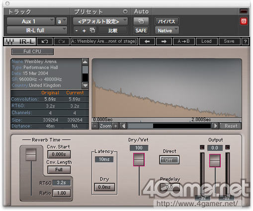 유명한 영국 Wembley Arena (웸블리 아레나)의 IR 데이터를 Waves Audio 제의 콘볼 루션 리버브 알고리즘 처리 도구 "IR-L"에서 보았는데. 아레나 홀은 잔향이 길기 때문에 중앙 왼쪽 창에서 "Convolution"의 모습을 보면, 총 5.69 초 IR 데이터가 있다.