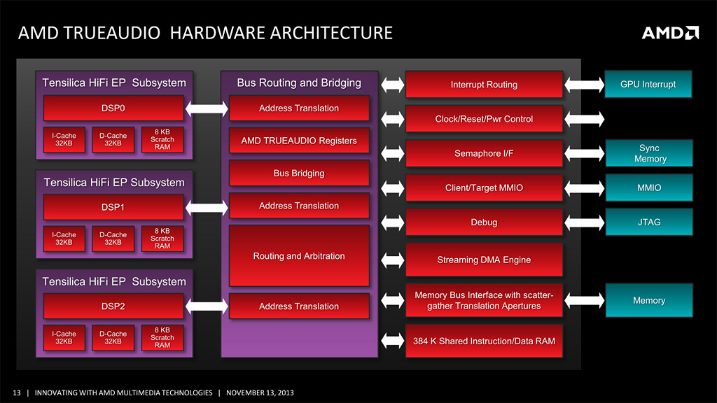 또한 공개 정보가 거의 없는 Xbox one 측도 Tensilica 제의 DSP를 통합하고 있다고 전해지고 있다. 그 정보가 정확한지 어떤지 필자는 판단 할 방법을 가지지 못하지만, 만일 옳다고 한다면 그 DSP가 TrueAudio과 연도 연고도 없는 것은 생각하기 어렵다.