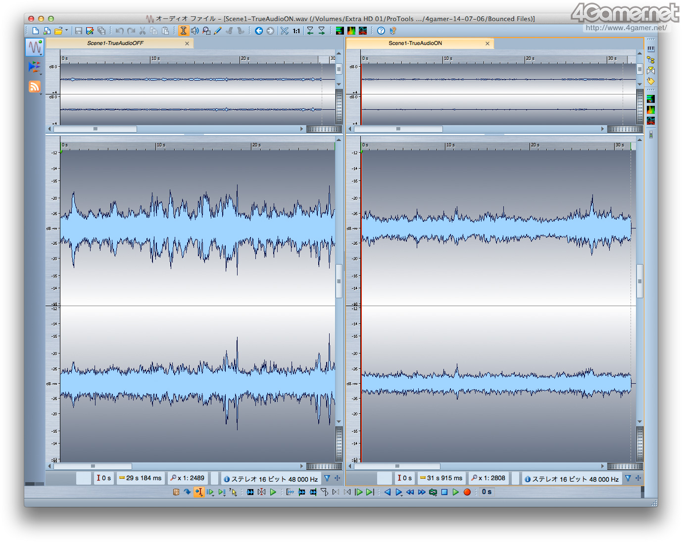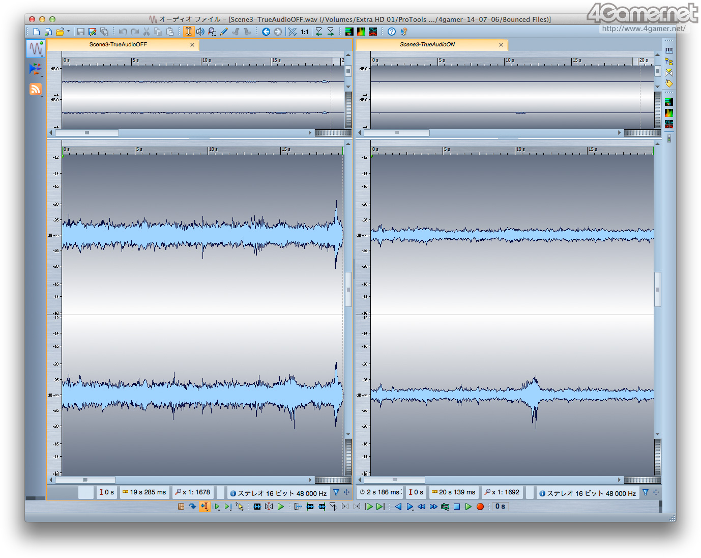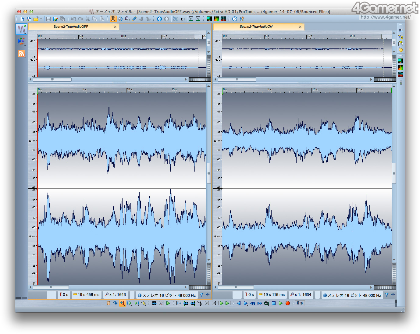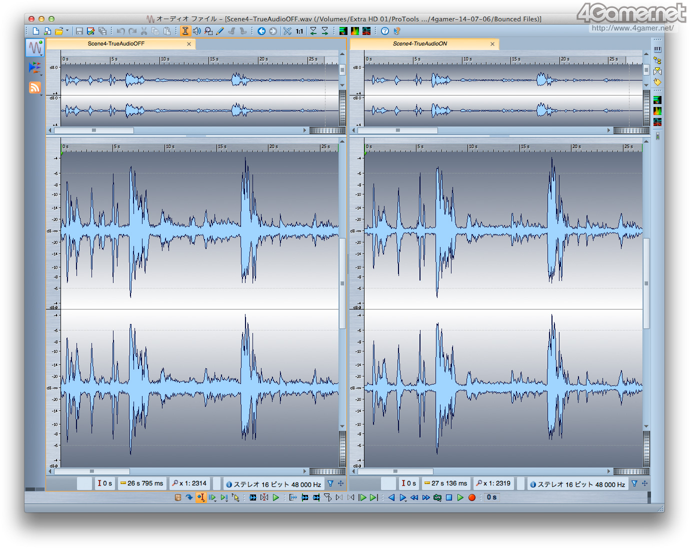 독일 Steinberg 제 소프트웨어 "WaveLab 8"을 이용해 녹음한 Wave 파형의 차이 (= 진폭의 차이)를 비교 한 것. 윗쪽이(원문 왼쪽) 녹음 1에서 아래쪽이 녹음 2의 결과다. 모든 이미지에서 왼쪽 그래프가 TrueAudio 무효시, 오른쪽 그래프가 유효시의 것이 되지만, TrueAudio을 유효화 하면 진폭이 약해지는 것을 알수 있다고 생각한다.