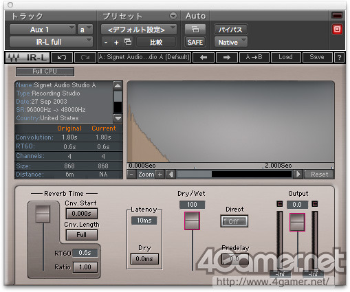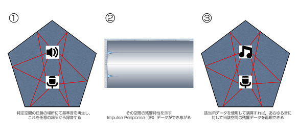 덧붙여, 여기에서는 "실제하는 공간에서 계측한 음향 데이터를 바탕으로 다른 소리를 익 혔을 때의 잔향을 실시간으로 연산하는" 모양이 되는데, 이러한 연산을 수학으로 넣어 (콘볼루션)한다. 콘볼루션 리버브라는 이름의 유래는 이것이다. 따라서, 콘볼 루션 리버브의 생명선은, 처리하는 프로세서의 연산 능력뿐만 아니라 전문 용어로 " 임펄스 응답 "(Impulse Response, 이하 IR) 이라는 해당 공간의 계측 데이터에 이르게 된다.