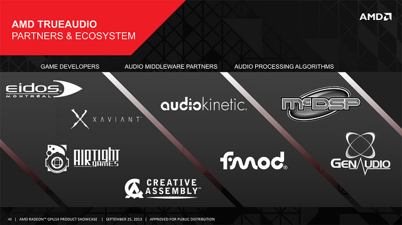 2013년의 TrueAudio의 발표 시점에서 Audiokinetic과 FMOD 지원은 밝혀져 있었다