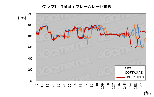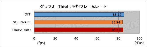 사실, 설정을 "TrueAudio"로 해도 "SOFTWARE"로 해도 얻을 수 있는 콘볼루션 리버브 효과는 변함없고, 청감상의 차이도 전혀 없다. 이 점은 "CPU 기반과 TrueAudio 기반으로 Thief의 콘볼루션 리버브에 차이가 있는건가?"라고 AMD에 확인했다. "현시점은 없다. 혜택은 DSP로의 오프로드와 (차후 등장하는)보다 복잡한 오디오 스트리밍 지원이다"라는 답변도 얻었기 때문에, Thief에서 TrueAudio를 이용하는 것의 이점은 CPU 및 메모리 부하의 경감만이라고 이해해도 좋다.