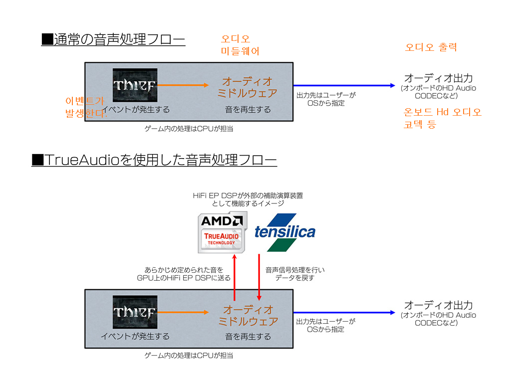 게임 프로그램 측에서 보면 TrueAudio 대응 GPU에서는 그 일부가 오디오 처리를 행하는 코프로세서 (co-Processor 메인 프로세서를 보조하는 프로세서)적으로 동작하는 이미지다. 처리 흐름으로 말하면 오디오 신호를 게임에서 보조 프로세서로 보내고, 거기서 처리하고 다시 돌려 받고, 사운드 장치로 출력하는 느낌이다.