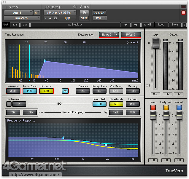 이스라엘 Waves Audio 제인 디지털 리버브 용 음성처리 알고리즘 "TrueVerb"의 스크린 샷. 2 개 그래프 중 위에서 확인할 수 있는 주황색 세로줄이 초기 반사로, 보라색 삼각형이 잔향 후부이다. 세로축이 신호의 강도로 위로 갈수록 커지고 가로축은 시간축. 왼쪽에서 오른쪽으로 시간이 경과해 가는 가운데 잔향을 조절할 수있는 셈이다. 초기 반사와 잔향 후방을 별도로 편집 가능한 것이 포인트