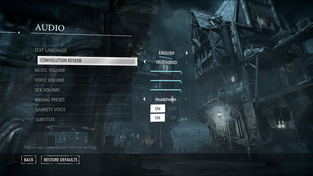 Thief의 "AUDIO"메뉴. "CONVOLUTION REVERB"는 바로 보이는 항목으로 "TRUEAUDIO"를 선택하면 HiFi EP DSP에서 콘볼루션 리버브 처리가 이뤄지게 된다