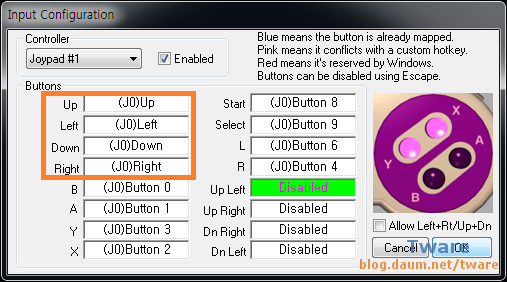 실제 게임기 패드의 상,좌,하,우, B,A,Y,X, 스타트, 셀렉트, L, R 버튼에 대응시킬 키보드의 키나 조이패드의 버튼을 설정 합니다.