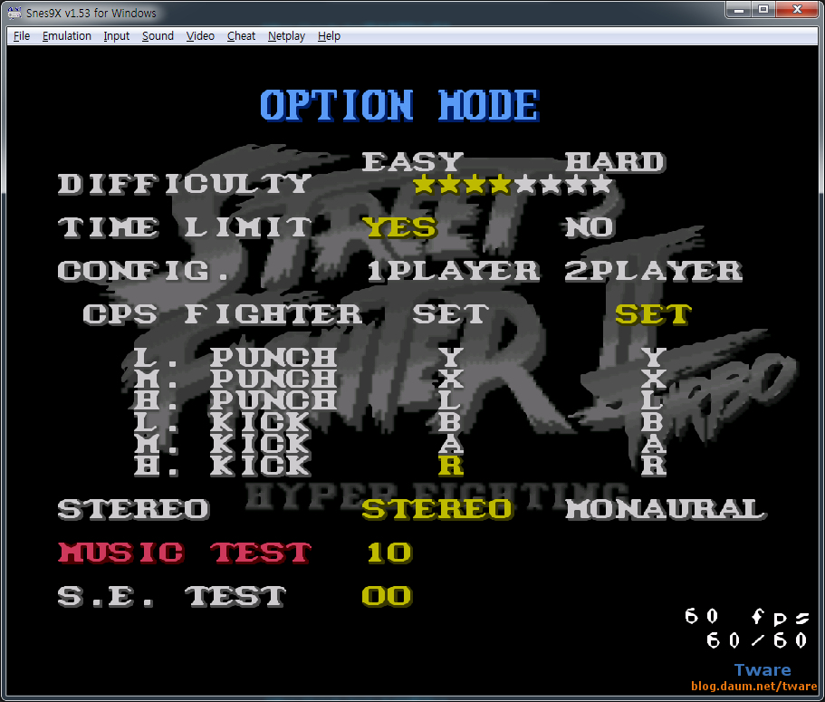 SNES9x의 경우 에뮬레이터 자체의 사운드 부분은 딱히 만질 필요가 없고, 제대로 된 사운드를 듣기 위한 것으로 게임내의 사운드 부분을 설정해 주어야 하니다. 게임기의 경우 PC 처럼 외부 스피커나 헤드셋등을 이용하는 형태가 아니라, 가정의 TV에 연결해서 즐기는 기기이기 때문에 TV에 맞춰서 만들어야 하죠. 슈퍼 패미콤이 나오기 한참 전인 80년대 부터 이미 TV도 스테레오 스피커를 갖추고 기타 서라운드 기능까지 있는 TV도 있지만, 반대로 이전의 모노 스피커만을 가지고 있는 TV도 있어서 인지, 게임 내에서 스테레오, 모노 사운드를 선택하도록 되어 있는 경우가 많습니다 (이 외에 서라운드 까지 지원하는 게임도...). 문제는 많은 게임들이 기본 스테레오 이지만, 기본 값이 모노로 되어 있는 경우가 있다는 겁니다. 이런 게임들은 게임 내에서 스테레오로 바꿔 주어야, 좌우 스피커 또는 헤드셋에 맞는 스테레오 사운드가 나오게 됩니다. 위의 스트리트 파이터2 터보의 경우도 옵션의 사운드에 모노와 스테레오가 보이죠. 스트리트 파이터2의 경우는 기본값이 스테레오 이지만, 그렇지 않은 게임들이 있습니다. (만약 스피커로 듣는데 잘 구분이 안된다면, 좌/우 스피커의 간격이 너무 좁은건 아닌가 확인해 보세요.).