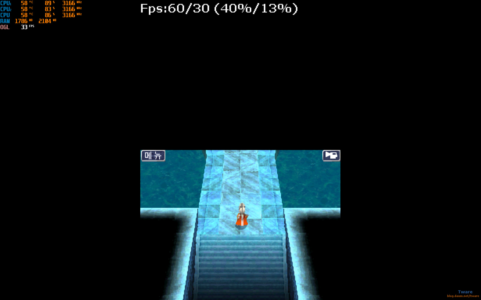 추가로, ESC키를 누르면 메뉴를 보이게 안보이게 할 수 있는데, 안보이게 하면 그만큼 위와 아래에 공백이 생깁니다. 게임 화면을 보는 것에는 차이가 없다는 거죠. 더 보이고 덜 보이고 이런게 없다는 것.