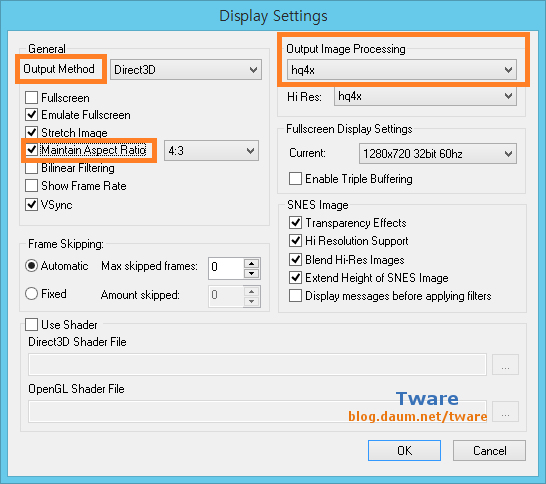 표시는 따로 안했지만.. 혹 구형 PC에서 돌릴때 게임이 너무 느리다면, Frame skipping 에 숫자를 올려줘서 프레임을 스킵하면 됩니다. 그러면 정상적인 게임속도로 할 수 있죠. 대신 프레임을 뛰어넘고 실행되니까 부드러운 화면으로는 못보겠죠. 근데 이정도 구형 PC에서 돌리는 거라면, ZSNES로 돌리는게 더 좋고, 필터같은거 다 안주고 하면(출력 이미지 처리) 펜3급에서도 잘 되죠. 이정도급 PC면 윈도98에서 도스용 Zsnes로 돌려도 되구요. 혹 고전게임용 윈도98 + 펜2,3,4 + 도스/윈도게임용 PC가 있다면, ZSNES 도스용으로 하세요.