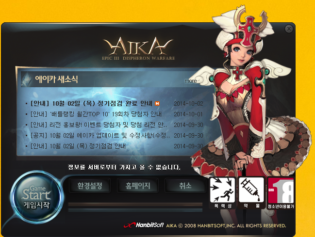 테스트 PC에서 위와 같이 첫 실행때 " 정보를 서버로부터 가지고 올 수 없습니다" 라고 나와서 컴이 버벅이고 CPU 100% 찍어서 그러나? 했지만.. 다른 PC 에서도 마찬가지 라서 그림을 추가. 이상태로는 " 게임시작" 버턴을 눌러봐야 게임 실행 불가!! 해결책은 창을 닫아 버리고 다시 홈페이지 스타트 버튼 누르기.. 또 안되면 반복.