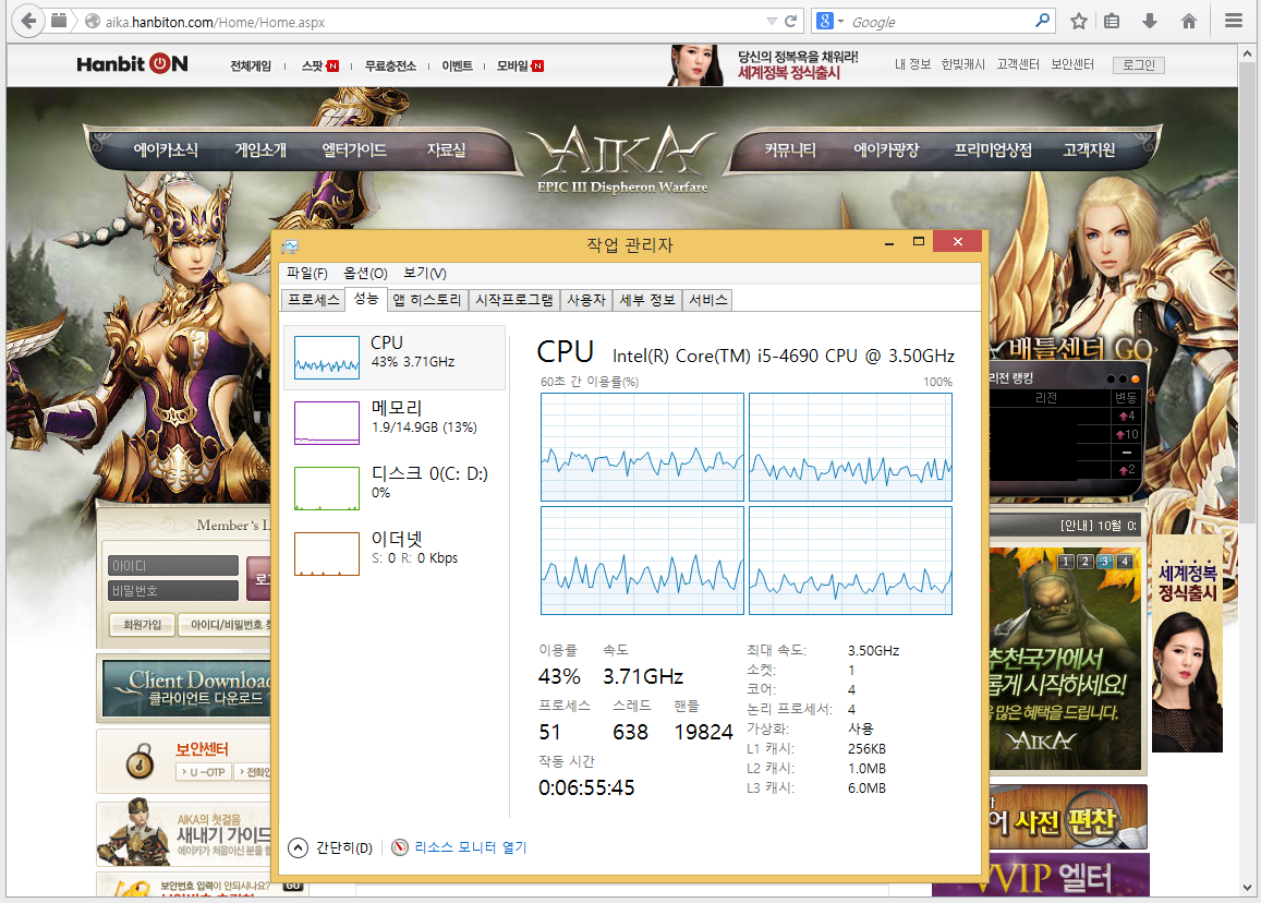 설치후 홈페이지 스타트 버튼 클릭.... 바로 뜨지 않으니 (홈페이지 표시 만으로도 CPU 100% 이기 때문에) 인터넷 익스플로러를 최소화 시키면 바로 에이카 온라인 실행창이 뜹니다. (플래시가 화면에 안보이면 CPU 안잡아 먹죠. 설치 할때도 웹브라우저 최소화 시키세요. 안하면 저사양 컴은 하루 종일 설치합니다.;;)