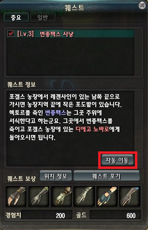 특히 퀘스트 목록 창에서 퀘스트를 완료한 뒤에 자동이동 버튼을 누르면 퀘스트 NPC 까지 자동으로 뛰어가는 점은 초보자를 위한 좋은 방법으로 보입니다.