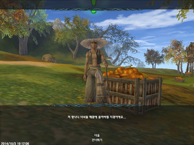 퀘스트 받는 화면. 최저옵션이라도 보일만한 곳은 다 보이고, 이 사양에서 게임이 가능하다는 점, 또 온라인 게임이라는 특성을 감안하면 그래픽은 나름 괜찮다고 할 수 있겠습니다.제가 가장 오래해본 게임이 와우 이다 보니 와우를 예를 들면, 와우의 최저 시야 거리 옵션 보다 훨씬 멀리까지 보입니다. 또한 최저사양 옵션일 때도 캐릭터 그림자를 더욱 느낄 수 있도록, 단순 원형 그림자가 아닌 타원형의 좀더 길죽한 그림자를 방향에 따라 바뀌게 표현해 둬서.. 고급사양의 옵션처럼 실제 그림자 모양은 아니지만, 이러한 저사양 옵션에서도 그런 느낌을 가질 수 있게 한 점은 높게 쳐주고 싶습니다.