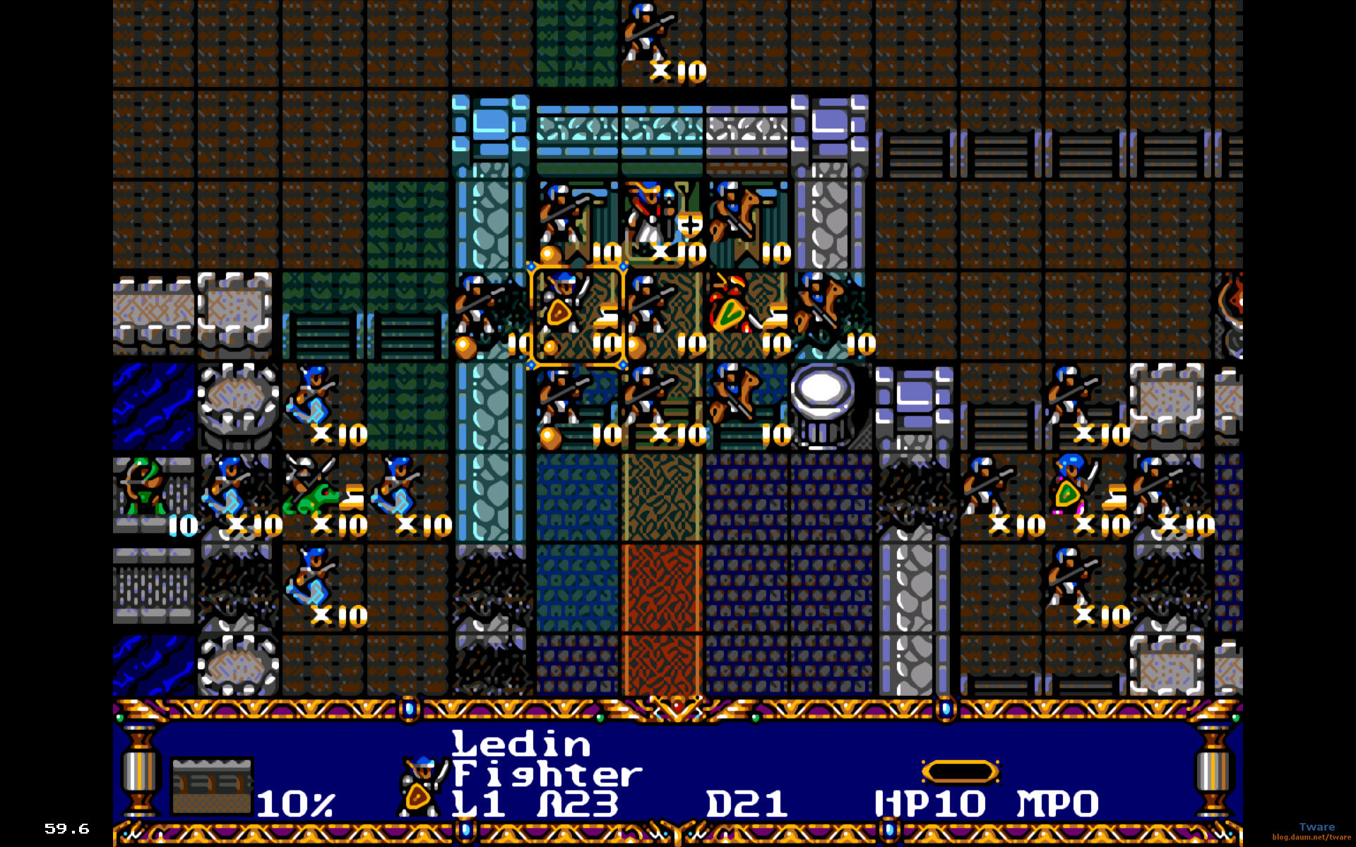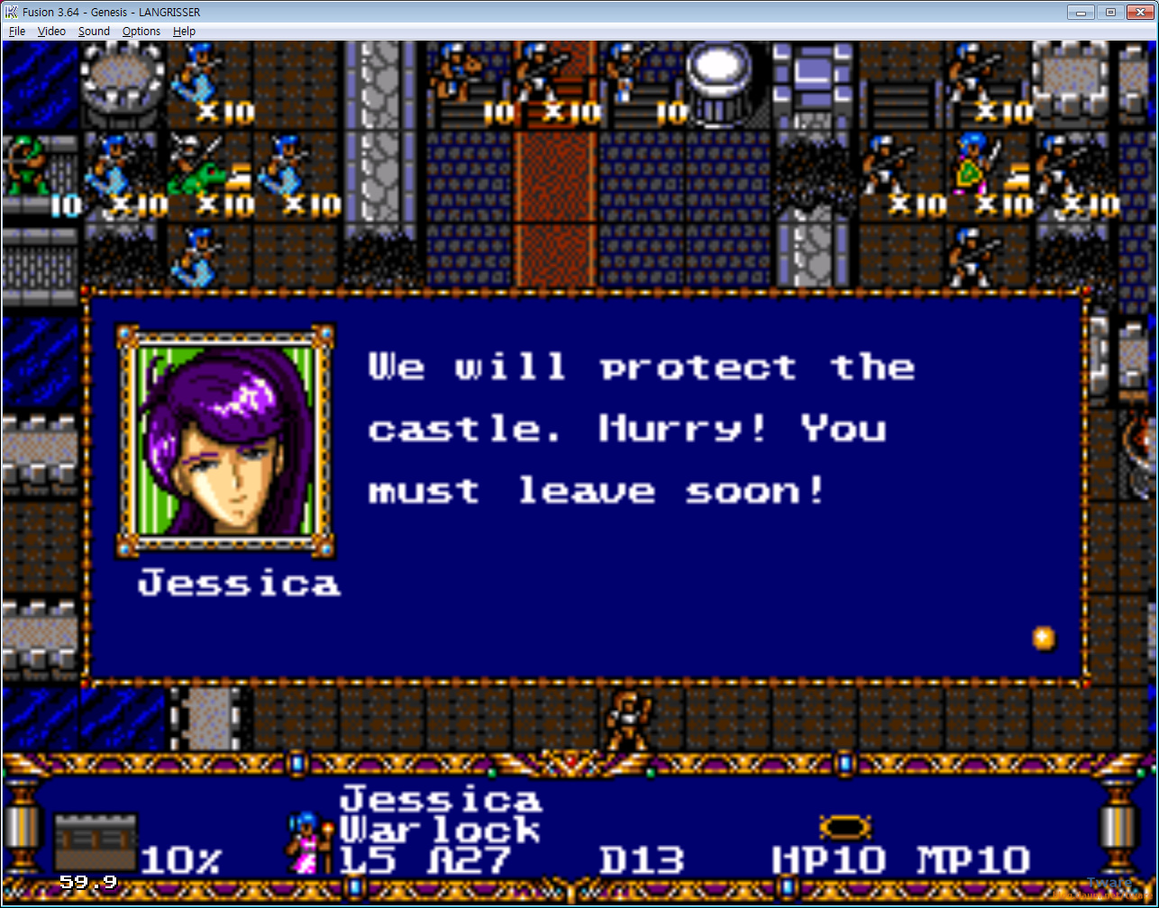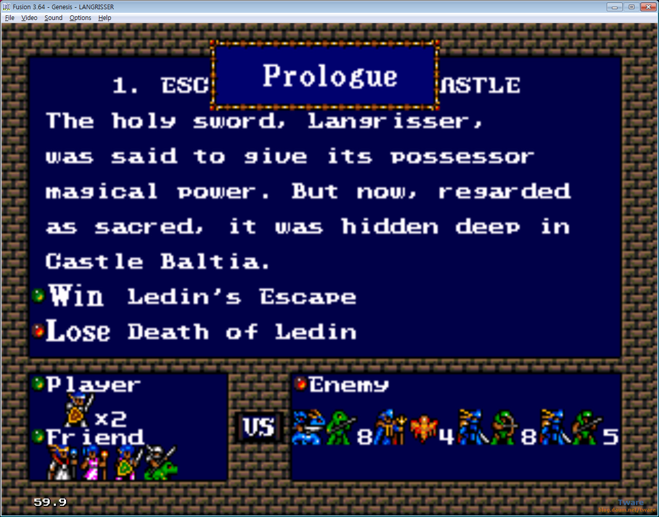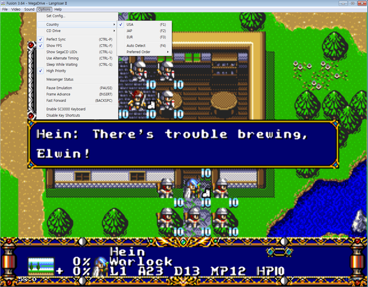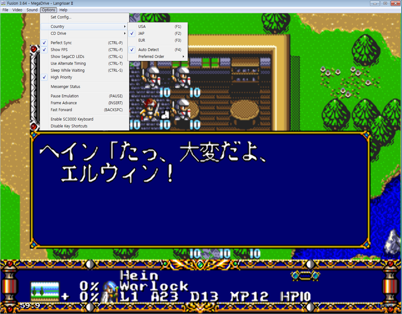 원본 랑그릿사2의 경우 그냥 하면 되고, 일본판만 존재하기에 당연히 일본어로 나옵니다. 위의 롬은 영문판 유저 패치인데, USA로 설정하고 해야만 영어로 나옵니다. 영문패치를 구해서 해봤는데, 왜 게임속 메뉴는 영어이고 캐릭터의 대사는 일본어로 나올까? 해서 찾고 찾아서 원본 패치만 배포하는 것을 찾아보니 이중패치라고 하네요. 그래서 컴퓨터 설정에 따라 다르다고 하는데, 에뮬에서 이렇게 USA로 설정한 뒤에 롬을 실행하면 이렇게 대사도 영어로 나옵니다.