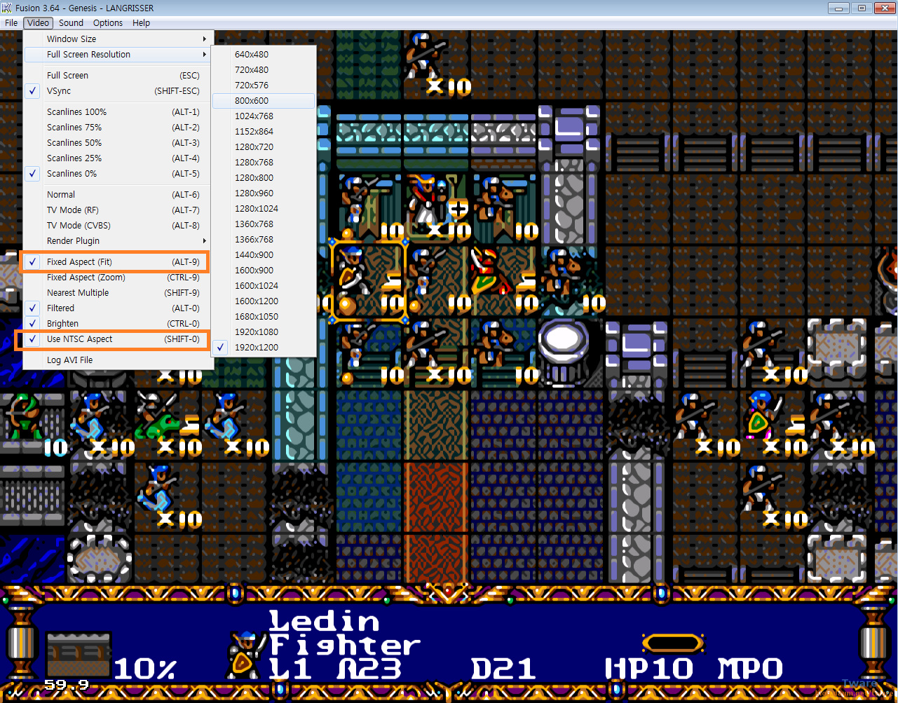 해상도 설정에서 창모드 해상도는 320x240 ~ 1280x960 까지 창 크기 자체가 전부 4:3 해상도 이고, Use NTSC (예전 미국,일본,한국 등 브라운관 TV 규격) Aspect 를 선택하면 창에 딱 맞게 화면이 나옵니다. 전체화면의 경우는 모니터의 해상도에 따라서 쭉 나오는데요. 와이드가 기본인 요즘 4:3 해상도의 낮은 걸로 할 수도 있겠지만, 이 경우는 그래픽 카드 제어판에서 GPU 종횡비 설정등을 하거나, 모니터 자체의 4:3 해상도 설정으로 보셔야 비율에 맞게 나옵니다. 요즘의 와이드 모니터의 경우는 최대 해상도 또는 비율과 같은 낮은 해상도를 설정한 경우에는 Fixed Aspect (Fit)에 체크를 하고 전체화면으로 게임을 하면 위와 같이 1920x1200에 게임 화면은 4:3으로 나옵니다. 프레임 표기는 검은 공간에 표기가 되죠. 풀 스크린 전환은 그림에 보이듯이 ESC 키를 누르면 되구요.