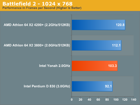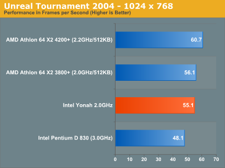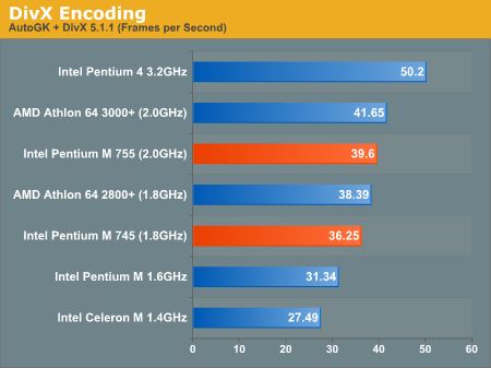 지금까지 대충 보면 펜티엄4는 본래부터 클럭당 성능이 매우 떨어집니다. AMD 64 (K8)은 이전의 K7을 기반으로 이걸 대폭적으로 개선하고 64비트 지원을 한 제품이죠. 프레스컷은 역시 64비트 지원 + 더 클럭을 잘 올릴수 있는 긴 파이프라인 구조.(프레스컷 이전의 윌라멧,노스우드도 펜3에 비하면) 그럼 인텔의 이 시기에 모바일용으로 출시된 펜티엄 M 베니어스의 성능은 어떨까요? 노스우드 시절까지는 모바일 제품도 펜티엄4 M 이라는 제품이 노트북에 쓰였지만 (펜티엄4 윌라멧은 전력과 발열로 인해 노트북에 쓰이지 않고, 노트북은 계속 펜티엄3M 을 씁니다. 노스우드가 나온 뒤에 노스우드 펜티엄4M 출시. 다음 프레스캇은 전력이 더 높기에 노트북용 펜티엄M (베니어스, 도선, 코어솔로/코어듀오 등) 개발은 인텔로는 필수 요소.), 이후 바로 모바일 전용인 펜티엄 M 브랜드의 (인텔 센트리노 노트북으로 유명한) 베니어스가 (130나노) 출시되죠. 베니어스는 펜티엄 3를 기반으로 대대적으로 개선해서 새로운 아키텍처라고 불릴정도로 만들어진 제품 입니다. (콘로를 만든 하이파 개발센터가 개발)
