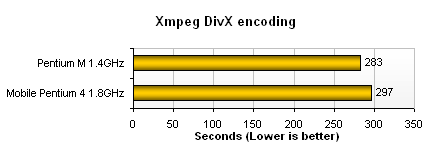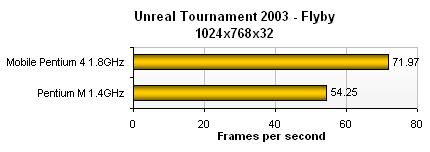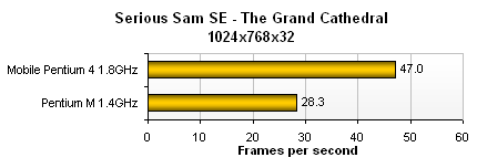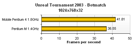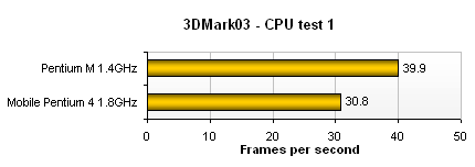이 벤치마크는 참고해야 할 점이.. 양 노트북이 같은 ATI 모빌리티 라데온 9000이지만, 펜티엄4 쪽은 64MB을 달고 있고, 펜티엄 M 1.4 쪽은 32MB 메모리를 가지고 있습니다. 3D 마크에서는 펜티엄M이 이기지만 실게임에서 떨어지는 부분이 메모리에 있는지도... 다른 벤치마크 프로그램과 실제 프로그램도 펜티엄M 1.4가 더 좋게 나오죠. 오로지 실 게임 빼고요.