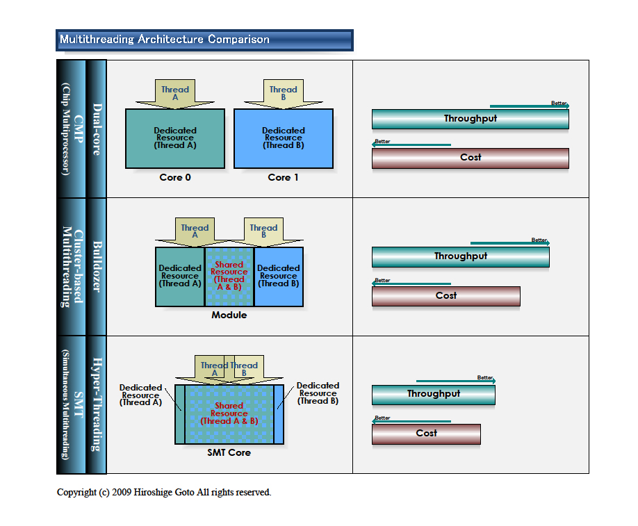 아래는 PC 용 CPU에서 볼 수 있는 대표적인 멀티 스레딩 아키텍처를 비교한 그림이다. 상단은 일반 멀티 코어 아키텍처. AMD는 전통적으로 "CMP (Chip Multi-Processor)"라고 부르고 있다. 중앙이 이번 Bulldozer 아키텍처. AMD는 "클러스터 기반 (Cluster-based) 멀티 스레딩"라고 부르고 있으며, 클러스터드 아키텍처 라는 것도 있다. 하단은 SMT (Simultaneous Multithreading) 아키텍처로 Intel Hyper-Threading이 대표적이다.