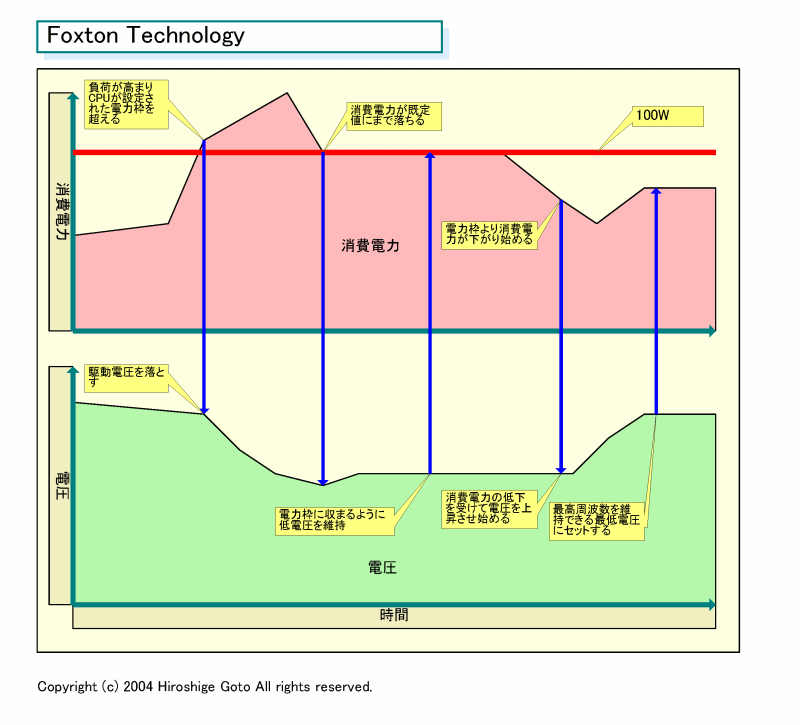 Foxton의 구조는 비교적 단순하다. CPU의 소비 전력이 규정의 테두리 (Power Envelope)를 초과하거나 CPU 온도가 기본값을 초과하면 Montecito는 자동으로 전압 (& 주파수)을 낮추기 시작한다. 전력 소비가 Power Envelope까지 내려 가면 그 상태를 유지 가능한 전압을 유지한다. CPU의 부하가 낮아 소비 전력이 Power Envelope을 밑돌기 시작하면 어느 정도의 지연 시간 후 전압을 상승시킨다. 그리고 보통 상태에서는 최고 주파수를 유지할 수 있는 최저 전압을 유지한다.