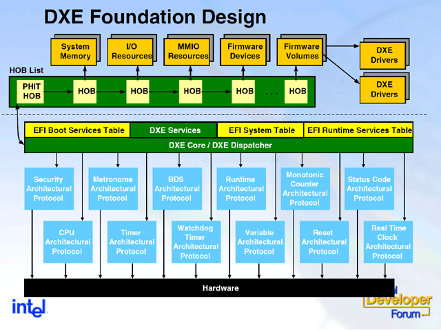 EFI 구조에서 중심이 되는 장치 드라이버와 실행 환경 (DXE : Driver eXecution Environment)에서 그 아래에 하드웨어 액세스를 제공하는 APs (Architectual Protocols)가 있다. 또한 BIOS와의 호환성을 제공하는 CSM (Compatibility Support Module)도 제공된 DXE에서 동작한다.