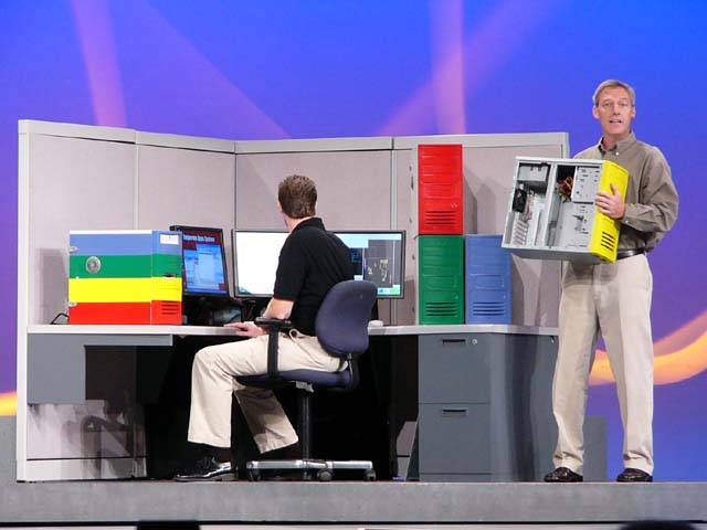 Otellini 사장의 키 노트에서 열린 VT의 데모. 핵심 응용 프로그램이 작동하는 빨간 머신, 개인 응용 프로그램이 작동하는 노란 머신, Linux에서 웍스테이션 어플리케이션이 동작하는 녹색 머신, 관리 도구를 실행하는 푸른 머신, 4대가 가상화 기술을 이용해 1대로 합치는 것이 가능하다. 라는 것도 알기 쉽다.