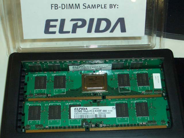 전시장 NEC Electronics America 부스에 있던 Elpida 제 FB-DIMM. 중앙 버퍼 / 인터페이스 칩 (AMB 칩)을 NEC Electronics America가 제공한다. 같은 칩은 Infineon 등도 발표하고 있다