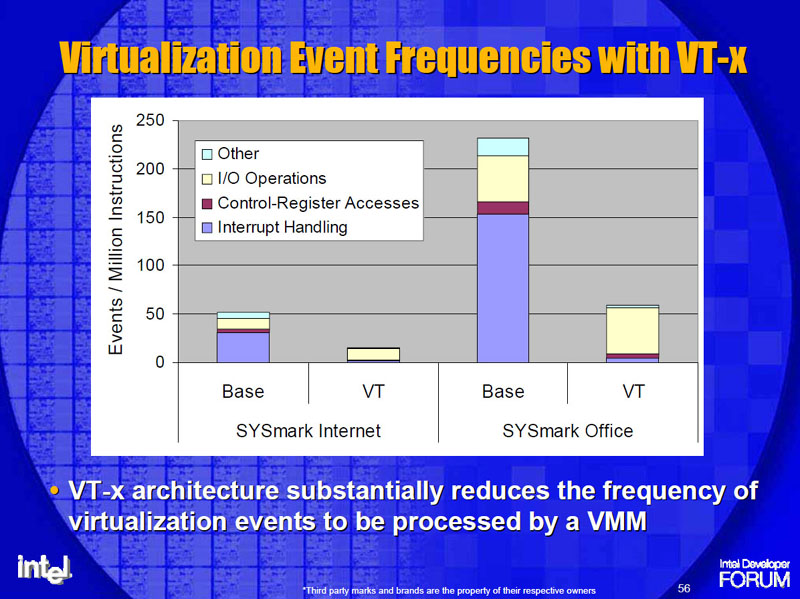 이것만으로도 상당한 성능 향상을 도모하는 것이 가능하다. Intel은 VT 사용때와 미사용 때의 하드웨어 이벤트 에뮬레이션 횟수를 공표하고 있는데, I / O 이벤트를 제외, 특히 인터럽트 처리가 극적으로 감소하고 있는 것을 알 수있다.