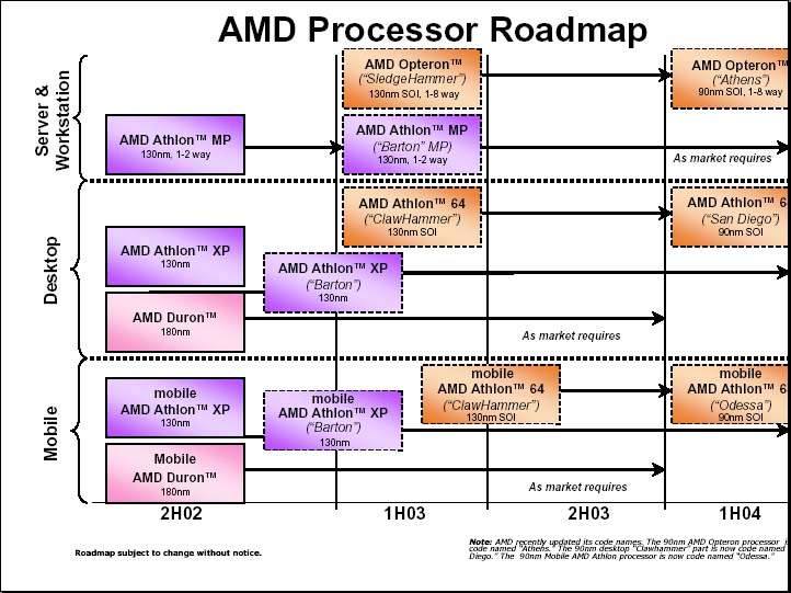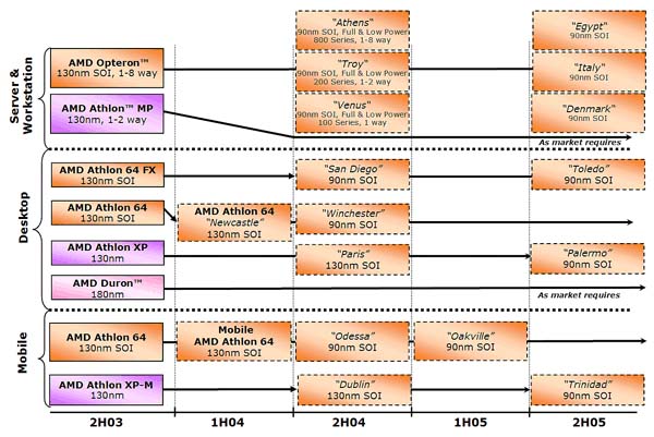 또 Athlon 64 (ClawHammer)의 90nm 버전으로 발표된 San Diego는 Athlon 64 FX의 90nm 버전이 되고, 출시시기가 2004년 상반기에서 하반기로 연기되었다. 또한 2005년 후반에 "Toledo 톨레도"라는 90nm 공정으로 제조되는 제품이 추가되어 있다.