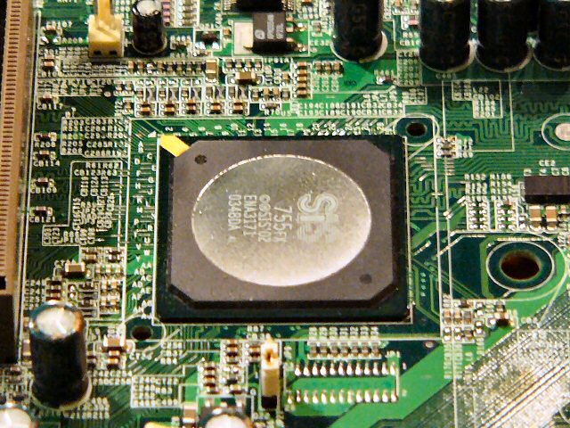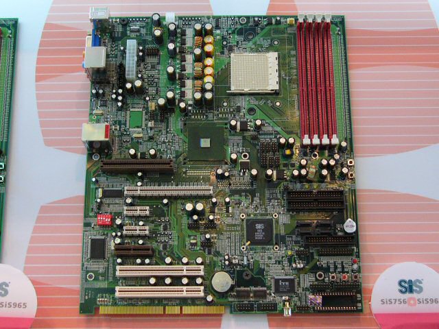 SiS 756은 PCI Express x16을 지원하는 칩셋. 마더 보드 제조 업체의 부스에서는 아직 동 칩셋 탑재 제품은 보여지지 않았지만, SiS 부스에는 PCI Express x16 × 1, PCI Express x1 × 2, PCI × 2, CNR × 1, DIMM × 4라는 구성의 레퍼런스 보드가 전시되어 있었다. 이쪽도 사우스 브릿지는 SiS 965.