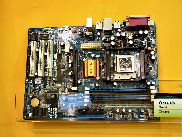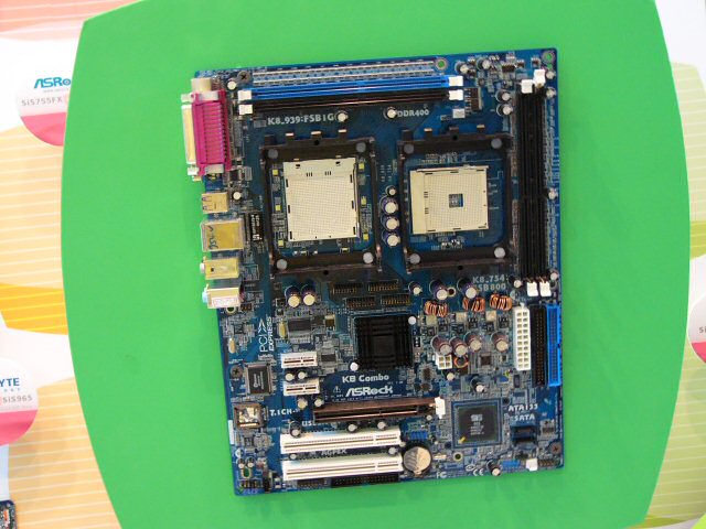 SiS 부스에 전시되어 한층 주목을 받은 것이, ASRock의 "SiS 755FX"탑재 메인 보드 "K8 Combo" 이 메인 보드는 Socket 939에 더해 Socket 754를 탑재하는 듀얼 소켓 사양이다. 메모리 슬롯도 각각의 소켓에 2장씩 준비되어 있으며, Socket 939는 듀얼 채널에 Socket 754에서는 단일 채널에 대응한다. 사우스 브릿지는 SiS 965.