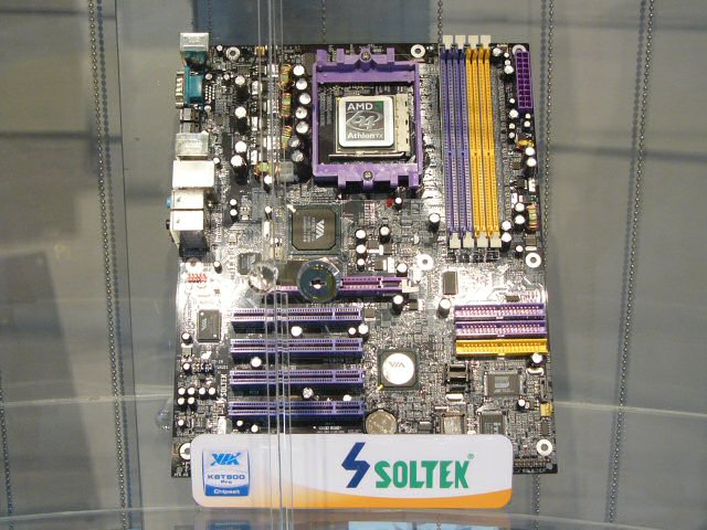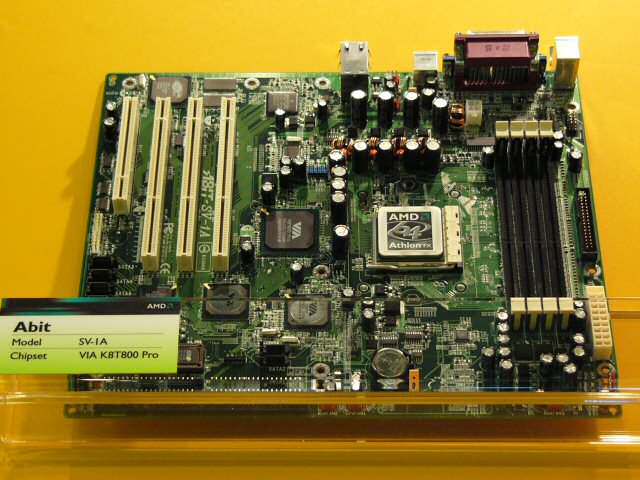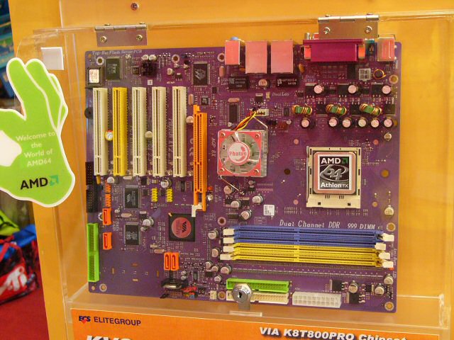 가장 많은 메이커가 탑재 제품으로 전시하고 있던 것이, VIA의 K8T800 Pro. CeBIT 2004에서도 많이 전시되어 있던 것에서 알 수 있듯이, 각사도 대개 양산 체제에 들어가 있는 모양으로 빠르면 6월 중순에 투입 된다고 한다. PCI Express는 지원하지 않고 거의 모든 메인 보드가 AGP × 1, PCI × 5의 구성.