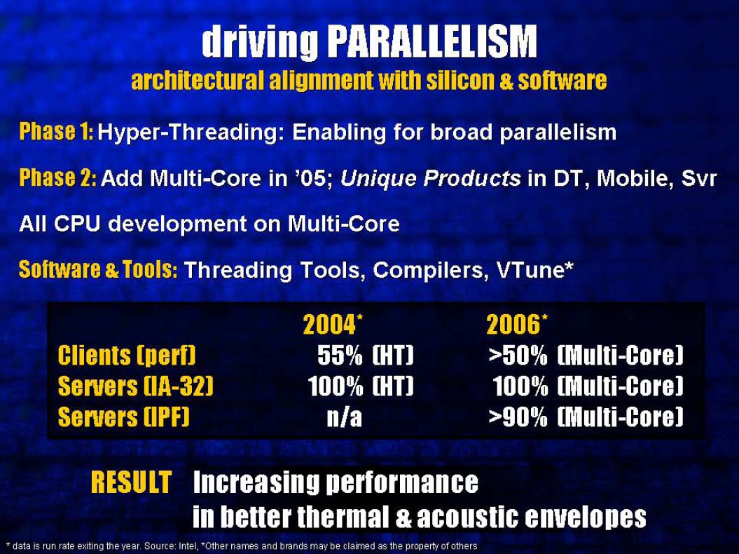 Hyper-Threading은 물리적으로 하나의 프로세서를 논리적으로 2개의 프로세서로 보이게 한다. 다음 단계는 하나의 프로세서에 복수의 코어를 내장하는 것이다. 앞으로 몇 년 사이에 물리적 병렬 처리를 지원하는 멀티 코어 프로세서가 다양한 구성으로 제공되게되는데, 그 시작이 2개의 코어를 내장한 듀얼 코어이다. (연설 전반을 통해 Otellini 사장은 멀티 코어 및 듀얼 코어를 별로 의식하고 구별하지 않는 것 같았다).