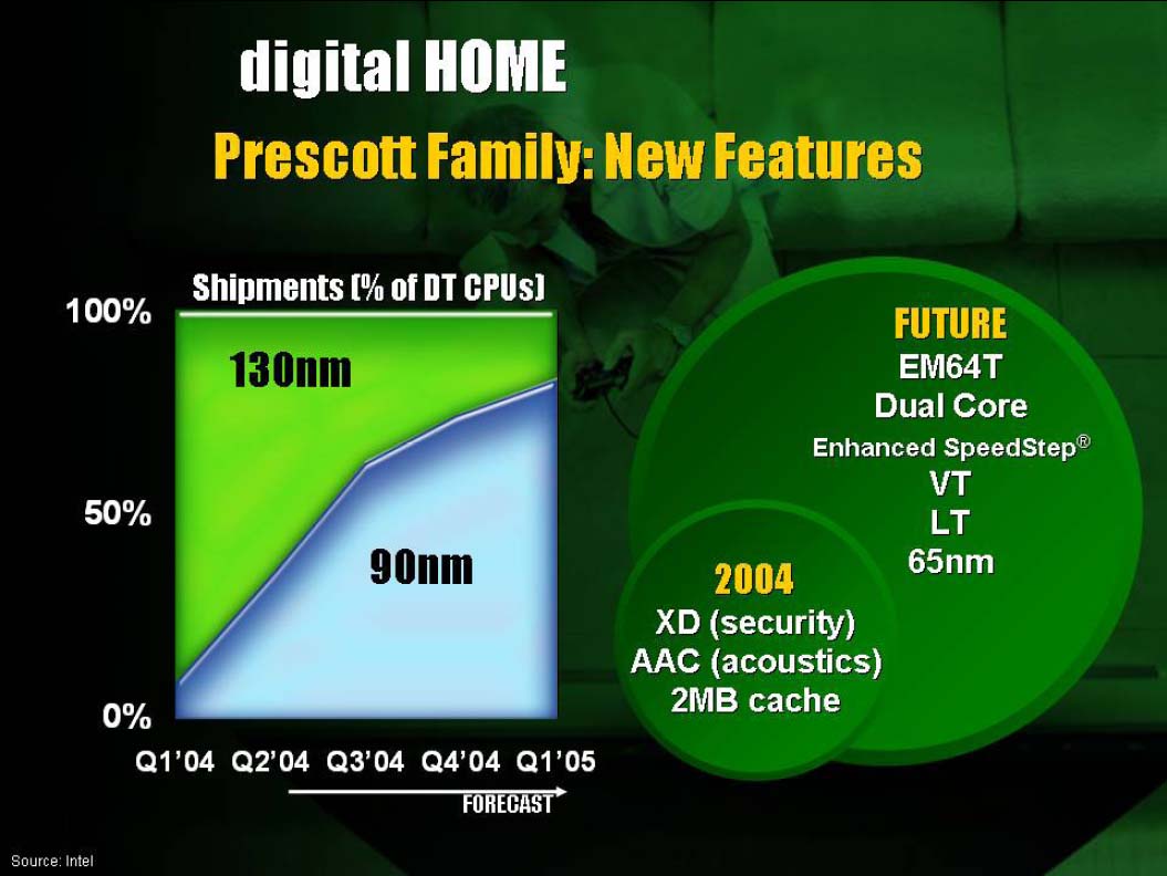 필자도 이 Web 캐스트를 보고 이 글을 쓰고 있지만, Intel은 이 이벤트 직전에 Prescott 다음으로 예정되어 있던 클라이언트 PC 용 프로세서 "Tejas" 와 그 듀얼 프로세서 서버 / 워크 스테이션 버전인 "Jayhawk" 예정을 취소한 직후. 전날에는 EPG의 Mike Fister 부사장의 사임 소식도 있던 직후 였다. 어떤 설명이 이루어 지는지, 사업 계획 변경은 있었는지 주목 했다. (Fister 씨의 사임에 대해서는 언급하지 않았지만).