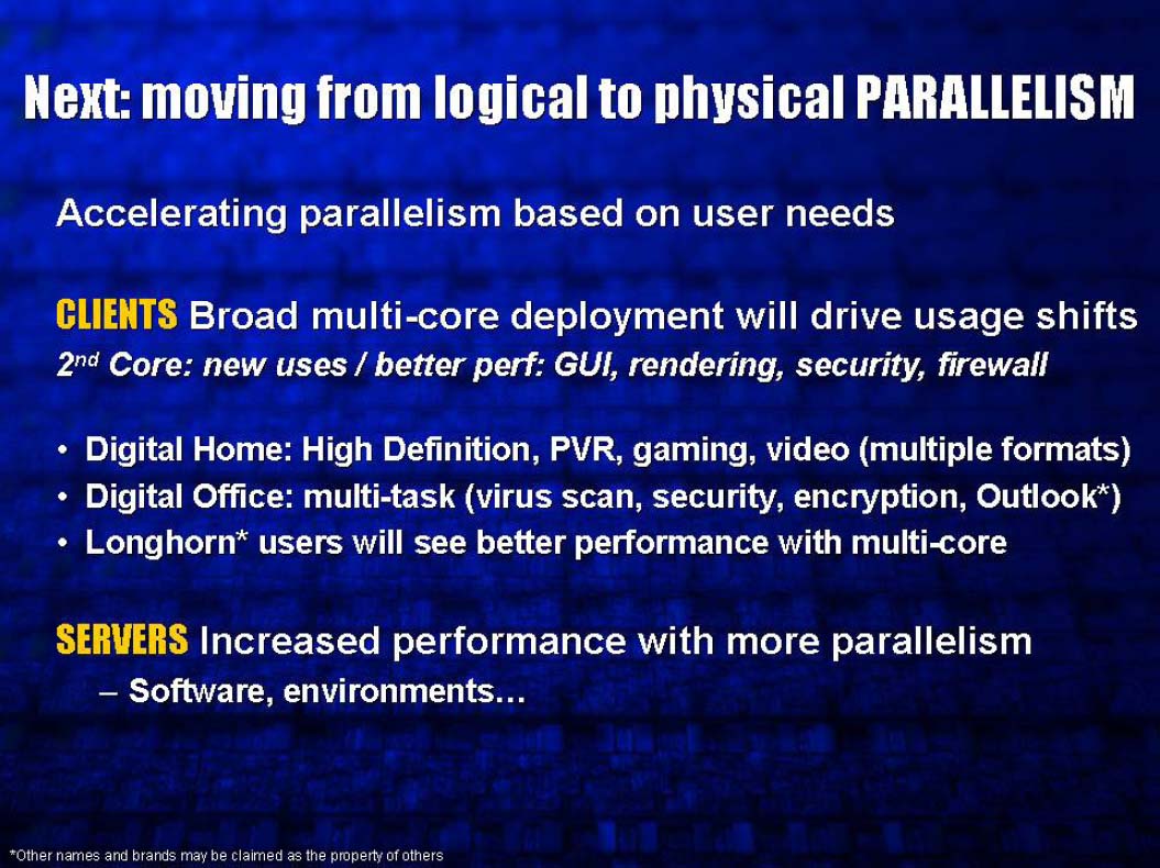 즉 OS에서 프로세서는 평등으로, 똑같이 스레드 디스패치를 받는다. Otellini 사장은 서버 분야에서는 멀티 코어 프로세서로 태스크를 배분해 병렬 처리를 행하는 것을 시사하는 한편, 클라이언트에서는 두 번째 코어를 다른 용도로 할당해 전체적으로 좋은 성능을 얻을 수 있는 가능성을 시사했다.