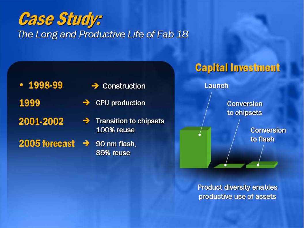 마지막으로 등단한 Andy Bryant 부사장의 연설은 어떻게 Intel의 비용 체질이 뛰어난가 라는 이야기가 중심 이었지만, 한가지 흥미를 끌 에피소드가 있었으므로, 소개한다. 그것은 이스라엘의 Fab18의 전환에 관하여 98 ~ 99 년에 건설된 이 공장은 당초 CPU (0.18μm 공정에 의한 Pentium 4의 양산이라 생각된다)에서 생산 품목을 칩셋으로 바꾸고 현재 90nm 공정의 플래시 메모리 공장으로 전환 중 이다 라는 것이다.