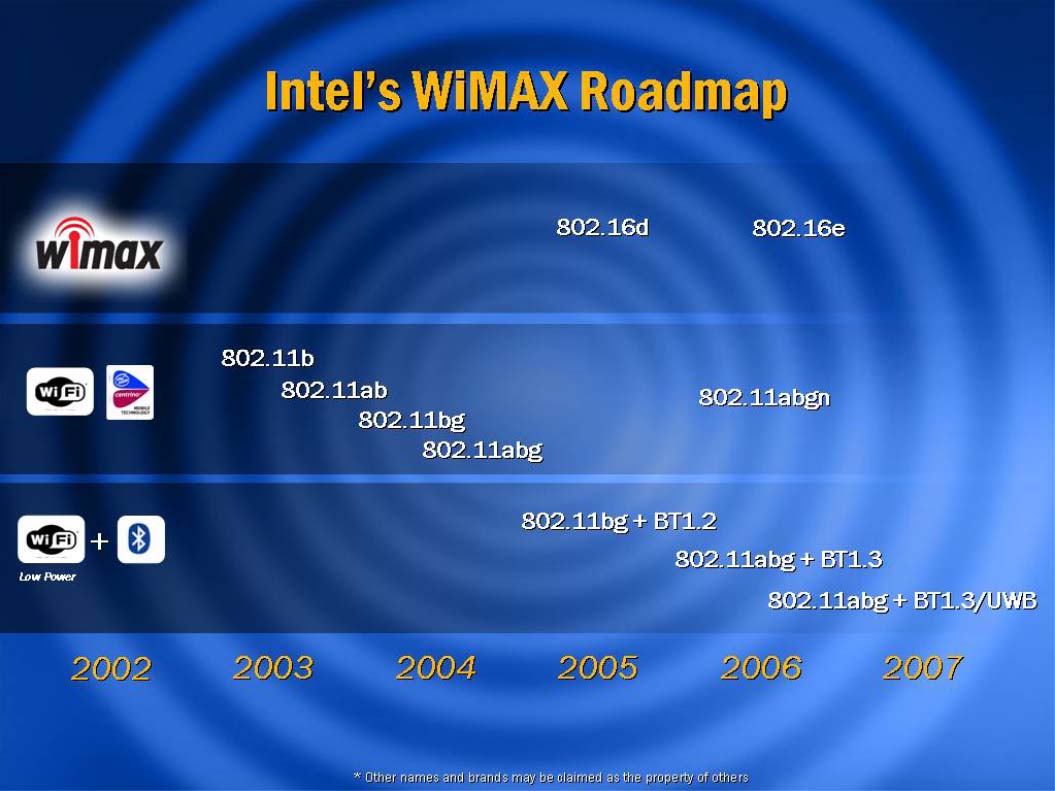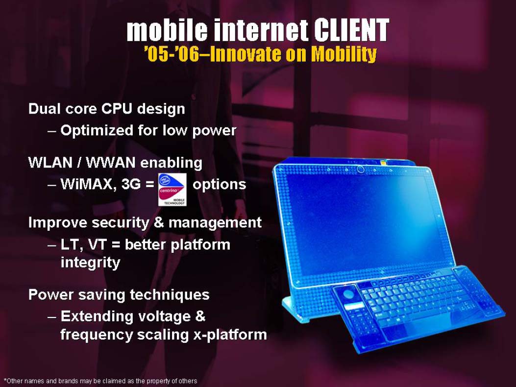 직전에 미래의 프로세서 취소하는 사건이 있었던 데스크탑용 프로세서에 비해 서버와 모바일 대해서는 그다지 새로운 이야기는 없었다. 그래도 모바일 대해 2005 ~ 2007년의 플랫폼에서는 데스크탑과 같은, 듀얼 코어, LT, VT 등 기술이 지원되며, Centrino 옵션으로 WiMAX와 3세대 휴대 전화 등 통신 기능을 더하려 한다. (그림 4).