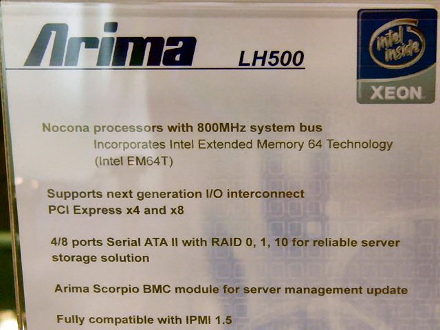 Arima는 미발표 Intel 칩셋 "Lindenhurst"를 탑재한 듀얼 CPU 메인 보드 "LH500"를 전시했다. Lindenhurst는 코드명 "Nocona"인 90nm 공정을 채용한 차세대 Xeon에 대응하는 칩셋. 설명서에 의하면, Intel의 64bit 확장 기술 "EM64T (Extended Memory 64 Technology) "를 지원 한다고 한다.