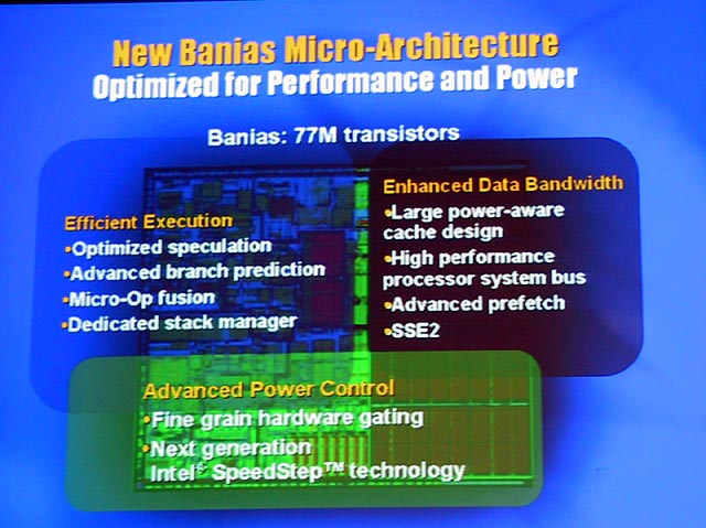 Banias의 특징은 Intel의 CPU로는 처음으로 0 에서 모바일 용으로 설계된 CPU 인 것이다. 지금까지 Intel의 모바일 CPU는 좋든 나쁘든 데스크톱 PC 용 CPU의 저전압 화에 의해 소비 전력을 낮춘 CPU 였다. 따라서 소비 전력은 어떻게든 노트북 PC에 들어가는 수준에 들어가며 왔지만, 원래가 데스크톱 PC 용이기 때문에 성능 당 소비 전력이라는 관점에서는 충분하다고는 말할 수 없는 것이었다. 그래서 Banias는 여러 가지 방법으로 성능을 저하시키지 않고 소비 전력을 억제하는 설계가 이루어지고 있다. 이로 인해 열 한계를 Pentium III의 시대로 되돌리고, 성능은 Pentium 4에 필적하는 것이다.