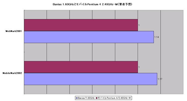 또한 성능에 관해서지만, "현재 구체적인 성능을 밝힐 수는 없지만 분명 놀라움을 주는 성능이다"(웨세스라 씨)라고 말하는 정도로, 이번 IDF에는 공식적으로는 공개되지 않았다. 다만 소식통에 따르면 OEM 업체에 대해서는 Banias는 같은시기에 출시될 예정인 모바일 Pentium 4를 상회하는 데이터가 공개되어 있다고 한다. 1분기에 출시될 예정인 Banias 1.60GHz는 같은시기에 출시될 예정인 모바일 Pentium 4 2.40GHz-M에 비해 MobileMark2002에서 17%, WebMark2001에서 14% 정도 상회하고 있다고 한다 (그래프). 실제 클럭 800MHz도 상회 모바일 Pentium 4를 능가할 정도의 성능이라면 충분히 놀랄만한 성능이라고 말할 수 있다.
